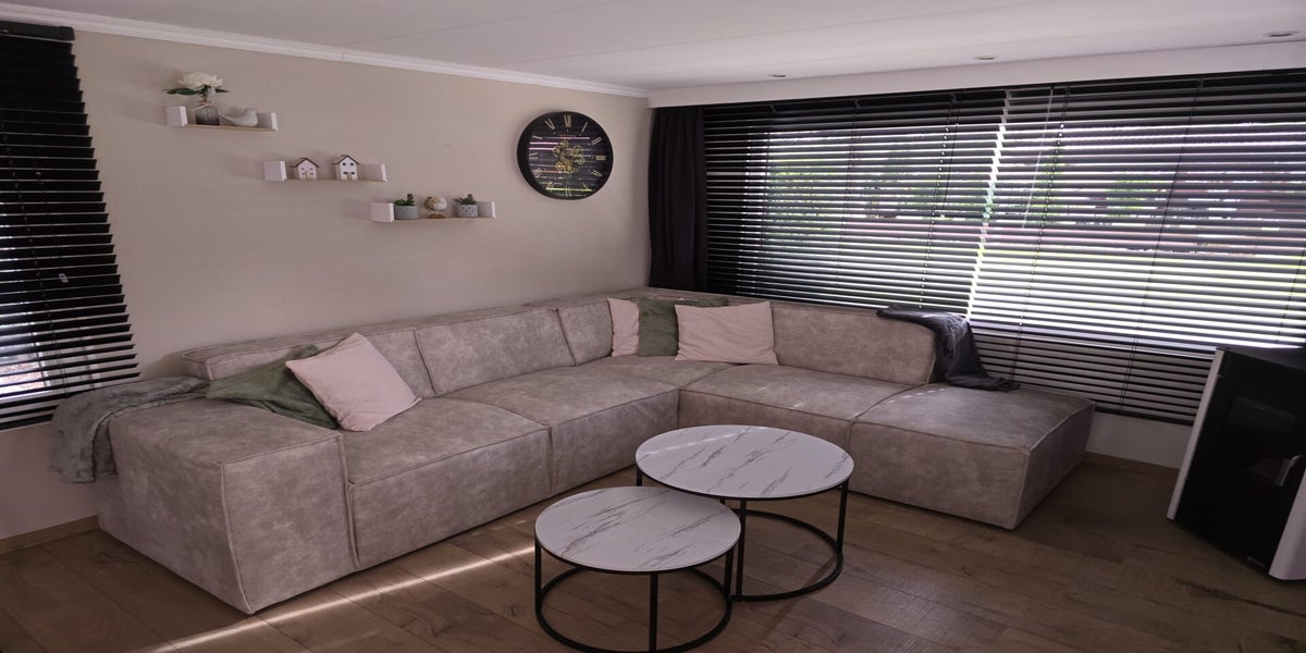 Onze woonkamer is sfeervol ingericht met een hoekbank en een pelletkachel, ook is er een airco aanwezig.